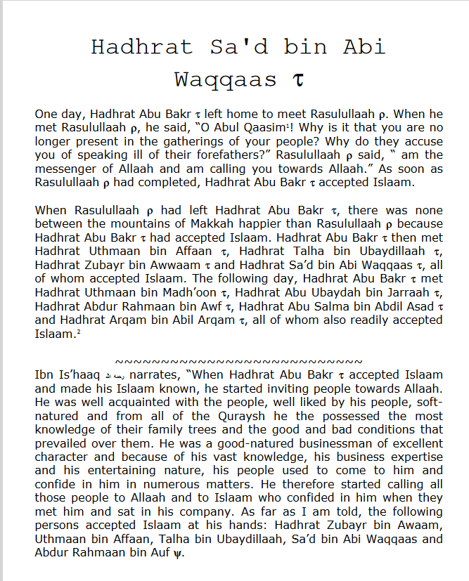 Hadhrat Sa’d τ says, “I was the first Arab to fire an arrow in the path of Allaah. When we used to fight battles with Rasulullaah ρ, the only food we had were the leaves of the acacia and lotus trees. In fact, when any