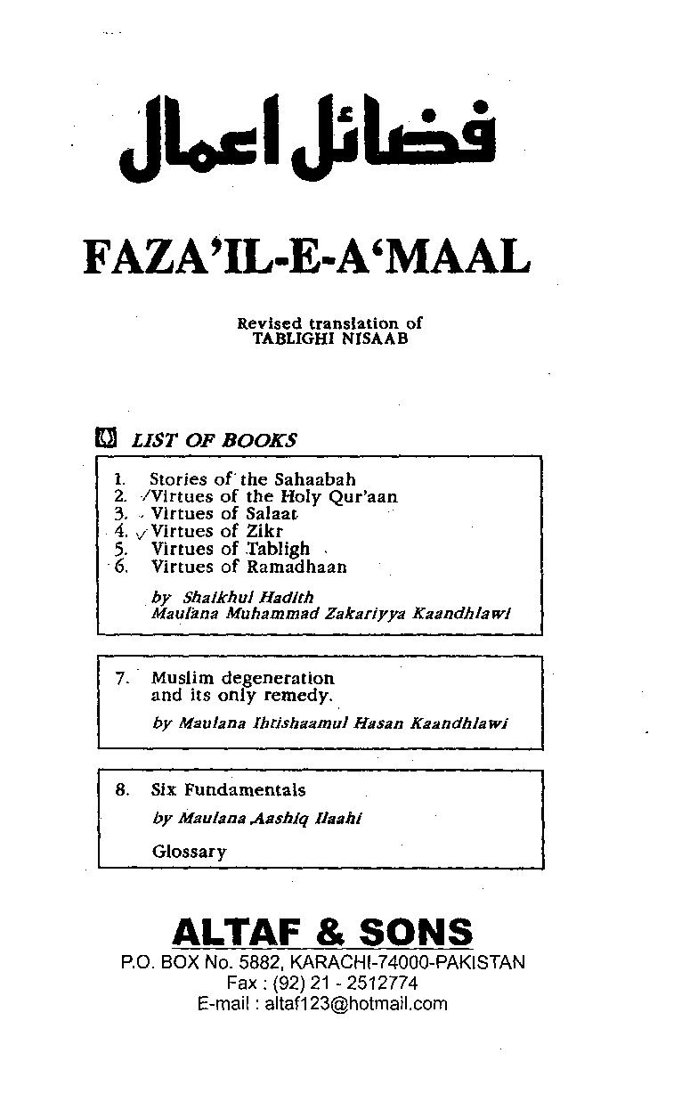 Download Stories Of The Sahabah RA Fazail e Amaal by Shaikhul Hadith Maulana Muhammad Zakariyya Kaandhlawi 1. Stories of the Sahaabah 2. Virtues of the Holy Qur’aan 3. Virtues of Salaat 4. Virtues of Zikr 5. Virtues of Tabligh 6. Virtues of Ramadhaan by Maulana Ihtishaamul Hasan Kaandhlawi. 14 Stories of the Sahabah 12stayed with … Continue reading Fazail e Amaal Stories Of The Sahabah RA