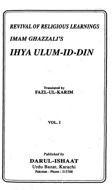 Ihya Ulum Al Din Vol 1 to 4 (complete) by Imam Ghazali. Through the unbounded grace of the Almighty God and blessings of the greatest Apostle of God, the English version of the Book of worship of the world renowned Ihyaul Ulum (Revival of religious learning) of Imam Ghazzali, the greatest thinker of the world of Islam, the Proof of Islam, the famous Sufi and devout, has now been published in full. This book Ihya is a sea of knowledge full of reasons and arguments, full of Quranic verses, traditions of the Holy Prophet and of the companions and the famous saints of early ages. Each subject was supported by the Quran, traditions and sayings of the learned sages and wise men and established by reasons and arguments.